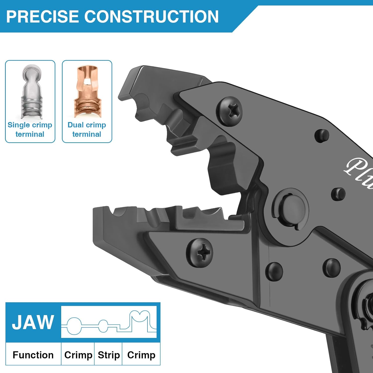 - ADJUSTABLE COMPRESSION WHEEL: Plustool crimping tool features a star wheel, which allows to adjust crimping height to ensure the right amount of crimping force depending on your crimping project; Heavy Duty Full-Cycle ratcheting terminal crimper with labor saving system helps to a easier operation