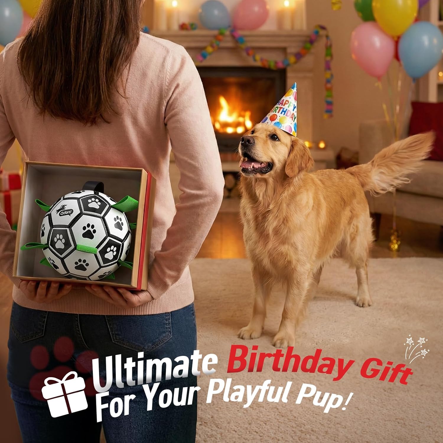 - Interactive Dog Toy: Dog soccer ball with nylon tabs sewn evenly into the seams not only create an erratic bounce that dogs love to chase, but also make it easier for the dogs to fetch, toss, tug and retrieve. Dog paws are printed evenly on the dog toy ball to attract dogs attention. There’s a longer strap for people to hold onto the ball, making it a great interactive dog toy to train your dogs